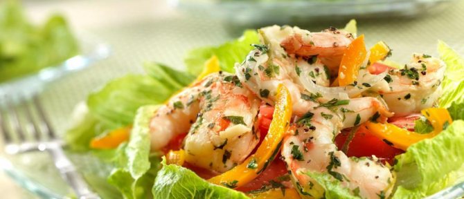 Креветки – это любимое блюдо многих искушенных гурманов. Совсем недавно продукт считался изысканным и дорогостоящим деликатесом. Сегодня его можно приобрести по вполне приемлемой цене. Креветки – это не только вкусное, но и полезное блюдо. Оно отлично подходит для тех, кто придерживается правил здорового питания. Продукт содержит много полезных веществ и благотворно воздействует на организм. В статье говорится о приготовлении диетических салатов с креветками.